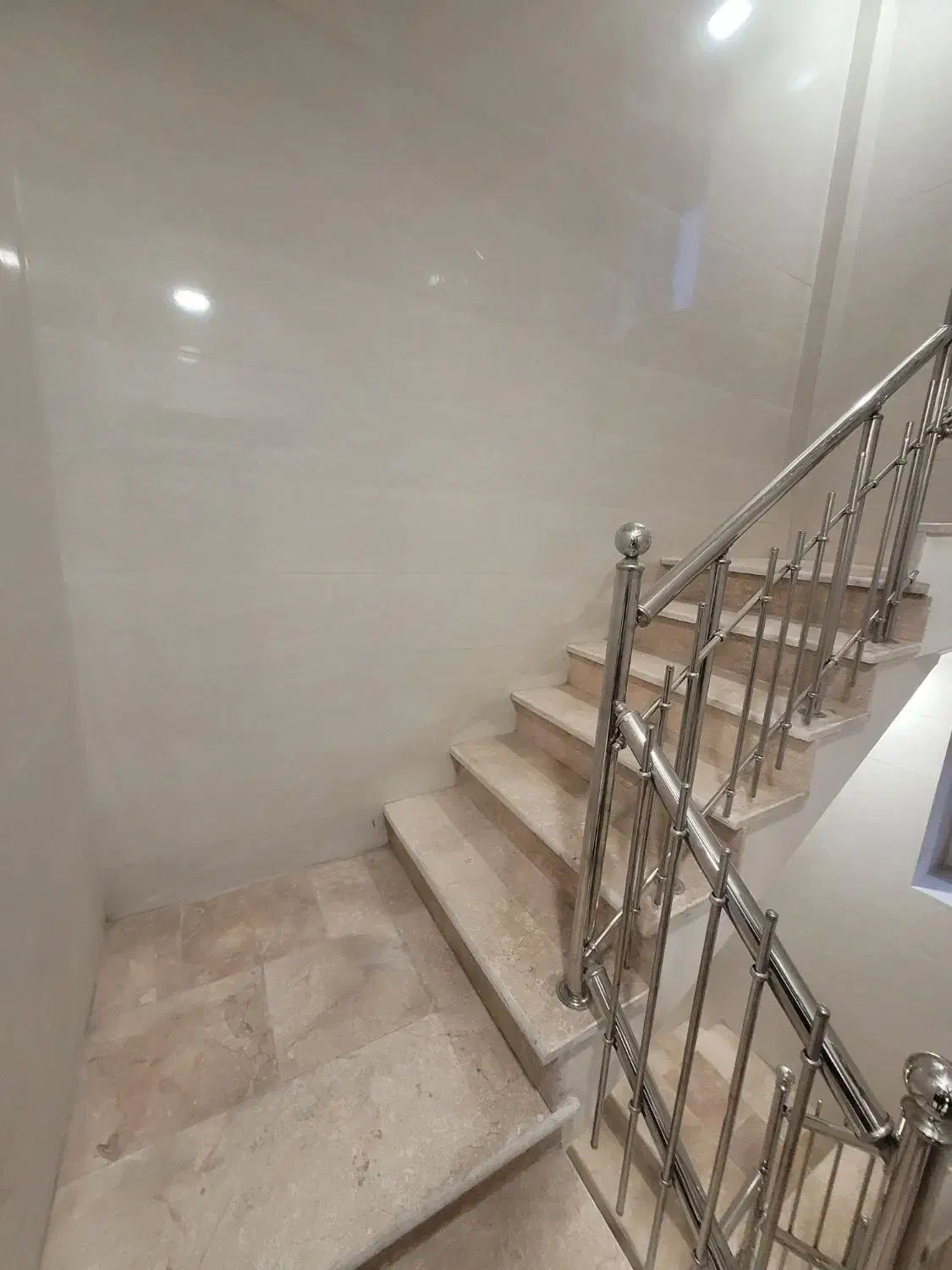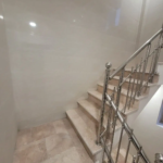 🧱 نمای ساختمان ترکیبی از سنگ و آجر به سبک مدرن است و راهپلهها تا سقف کاشیکاری شدهاند.